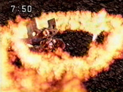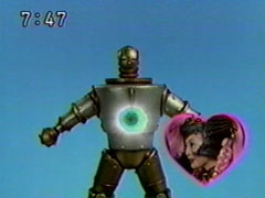 | A rocket is sent down to the Earth. It becomes a robot called the Copy Giant. Wendinu through a heart-shaped inset explains that it becomes a copy of the destroyed 'tool. ' It scans the debris and becomes Jishakkumon. | Oboro calls the Shinobi Machines, that teleport from their places and teleport from a plane, jet liner and feris wheel. They jump in the machines and the monster throws debris at them. The Hawk becomes engulfed in fire and circles around. |