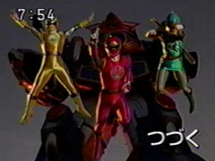 | Mugensai tells Oboro to use the max. emergency code. The others hear their changers calling. The monster is about to take care of Yousuke when ninja stars stop him. Kouta knocks him down. Red takes the stuff off and reunites with his friends. | They ask why he fought alone. When he apologetically tells them he didn't think they wanted to be Hurricanger. They may be developing lives, but foremost they are Hurricanger. Kouta apologizes for not wearing their Hurricane Gyros. |