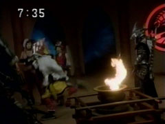 | Saandaru arrives and Satorakura goes to him. Shurikenger thinks back to when Saandaru killed Gozen. Saandaru strikes the backpack off Satorakura. When he whines that he wasn't done using this yet, suddenly Sandarusplits his maskin half | and he screams and falls face first. Saandaru laughs. Shurikenger gets up and kicks him down. They battle it out and Shruikenger takes his grief out about Gozen. He is knocked down. He makes a fist and gets up again. He goes to fire mode. |