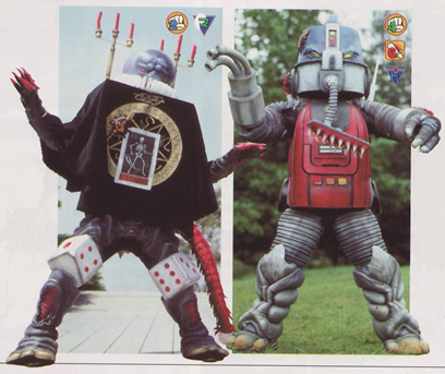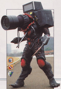 EPISODES 13-14 Camera Jigen People photographed by this monster would disappear and reappear in Maria's photo album. Kaori is made a victim, fading away in Gai's arms. Maria later threatens to burn the photo Kaori is trapped in if Gai transforms. He is taken in by the monster. Ryu then uses the newly assembled Fire Bazooka and releases the victims when Camera Jigen is hit. Camera Jigen was destroyed by Icarus Haken. |