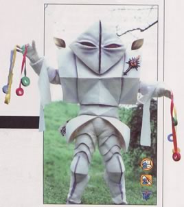 EPISODES 16, 27 Paper Jigen Paper Jigen resembled orgami and had the ability to give life to images. The sound of an Okarina paraylzes him. The Okarina is played by Shizuko, a girl from a painting brought to life by the monster himself. Shizuko was based on the painter's daughter who died in an accident. The painter was now in a coma, but is awaken when Shizuko plays him the real Okarina. If the monster is destroyed, Shizuko will disappear with it, but she tries to defeat the monster anyway with her Okarina playing. The monster kills her and The Jetman destroys the monster. |