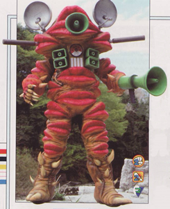 | EPISODE 15 Voice Jigen Voice Jigen was a monster covered with lips and armed with megaphones, fed on women's voices, leaving their voices jarring and bizarre. Voice Jigen turned the energy it stole to destroy buildings but he wants more power. Raita disguises as a lady in a kimono to trick the monster into taking his voice since he didn't go affect men. As a result, the voices are returned. |