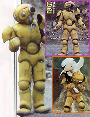 EPISODE 42 Trial Manufacture Robot G2 G2 is a little yellow malfunctioning robot created by Tranza with the mind and personality of a little child. When mocked by Radiguet, Toranza beats him up and the Grinam Soliders as well. After being kicked out by his creator, he was taken by Grey, who cared for him by a while. Grey gave him a new power cell to replace the one that had burned out. When G2 saw how much Grey was suffering without Maria, he went to the cave where Ryou was tending to her after she callapsed and he took her to Grey. He blocks Grey from one of Jetmen's attacks and is buried under a rock slide. When his systems shut down, he explodes. |