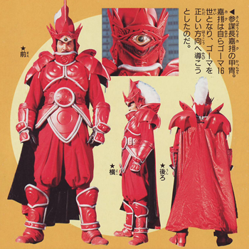 Chief Officer Jiaxu Jiaxu's Gorma red armor. He can lower his helmet and his third eye is prominent. |