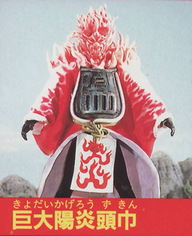 Giantic Heat Wave Hood Daigo almost made his own way out, with Kujaku's help but Gara couldn't take it anymore so she chopped off this gorma's head and he exploded, releasing the two captives. When this gorma grew, the monster took off his veil revealing a flame-like face. His hood came off before but he put it back on. Heat Wave Hood was killed by Dairen'oh. |