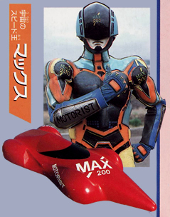 Speed King Max The 'Speed King of Space,' was a champion space car racer who Dappu looked up to. Everyone thought he died crashing into a vending machine in space. What really happen was that he crashed landed on a place and encountered Zelmoda and Grotch. Grotch brainwashed and deformed him using Forgetfulness Water-Gun, making him into KK Esu. Once he returned to his original self, he died protecting Dappu from Zelmonda. Dappu sat next to his corpse on RV Robo's hand as his spirit went to heaven. He only appeared in Episode 9. |
