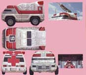 ![]() ![]() V Rescue: Pink's ambulance armed with launching giant hypodermic needle, transforms into Rescue Fighter. |