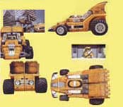 ![]() ![]() V Dozer: Yellow's dragster whose spoilers become a bulldozer bucket. V Dozer transforms into Dozer Fighter. |