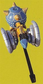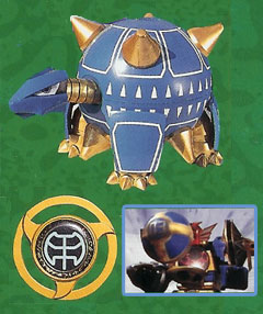 Karakuri Ball 03: Totasu Hammer Ranger: Hurricane Blue Totasu means Tortoise. Retractable chain for use as a swinging mace. Used by the Senpuujin. Specialty of the Hurricane Blue. Oboru teleports a Shinobi Medal to Blue to get this ball in Episode 6. The logistics of this robot was taken from a small paper that inside a Tortoise stone Nanami fetched from a location. |