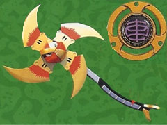 Karakuri Ball 04: Plant Axe Ranger: Kabutoraijer A pinwheel-like weapon with four deadly spiining blades. Primary weapon of the Gouraijin. The attack they use is "Axe Cutter". The Plant Axe combined with the Stag's horns, the attack is "Double Horn Cutter". The Goraijer stole it by hacking into the Hurricanger's system. Oboru made it. The Gouraijin has a port in it as well and that is how they intercepted the collection of the Shinobi medal for this ball. It appears in Episode 10. |