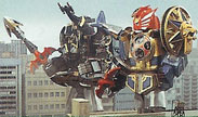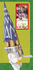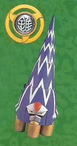Karakuri Ball 06: Squid Attacker Ranger: Hurricane Blue High energy drilling power for destroying monsters. Used by the Storm Megazord. It appears in Episode 14. When the ball comes out and opens, the Squid Attacker comes out but it's small with no point. The rest of it slowly pops out piece by piece upward. It points toward the opponent and spins clockwise. It attaches to the left red circle on the SenPuuJin's 'knee'. It makes a drill sound. To attack, the SenPuuJin sways it's left leg toward the opponent, the Attacker's pieces pop out apart a bit. White light flahses. Each piece turns clockwise with yellow lighting. The SenPuuJin then charges toward the opponent with a digital photo (a green grid screen appears and box pieces of image appears) of a giant moon behind the mountain.The attacker drills through the villain and smoke comes out. |