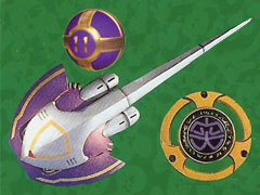 Karakuri Ball 11: Kabuto Gani Ranger: Kabotoraijer Horseshoe Crab shaped weapon attaches to the arm to be used as a lancing weapon. In Episode 24, the Shurikenger gives the Goraijer a shinobi medal to bring fought this one. The body is the hilt, the tail is the spear. They slice and dice the enemy, then spear him through. It shoots a yellow beam with green lightening around it. Used by the Gouraijin. |