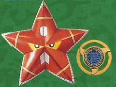 Karakuri Ball 14: Pitashito Hitode Alternate Spelling: Pitatto Hitode Hitode means Starfish. Appears in Episode 30. The attack is "Starlight Beat up!" The Shinobi Medal is given to Hurricane Blue. The Starfish goes on Senpujin's left knee. The Blue and Yellow Starfish aren't even seen in the episode!! They are finally seen in Episode 42. Senpujin fires four of them in an attack: red, yellow, blue and green. They land on a Jakanja and set electric blasts. |