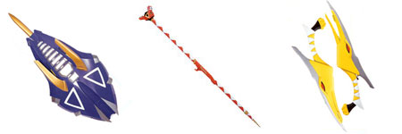 | Tricera Bunker, Tyranno Rod, and Ptera Daggers The Abaranger'sindividual weapons. The Abaranger's buckles glow a bright light and the weapons appeared. The weapon's mouth roar like the dinosaurs. |