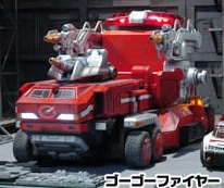 GouGou Vehicle #11: Gougou Fire Height: 22.1 m Width: 24.8 m Length: 45.5 m Weight: 3000t Output power: 380 km/horsepower Attack: Double Water Shoot Cameo: Episode 19 Full Appearance: Episode 20 BoukenSilver came to the rescue, piloting this vehicle and the other two. |