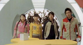 In the workshop, there is a shelf with each ranger color and their Bouken Drivers are there. |