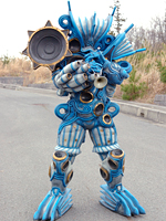 Kanadegami EPISODE 12 Height: 215cm to 57.0m Weight: 116.5kg to 31.0 tons Created by an antique firestove bellow and a new speaker and sent to retrieve the Pipes of Hamelin, he even used the silver one to make Masumi, Souta, and Natsuki fight Satoru and Sakura, but this was soon reversed. Defeated by the Dual Crusher (wielded by BoukenPink) and terminated by Super DaiBouken. NOTE: The First-Cheer Drum brought him back in Episode 24 along with others. |