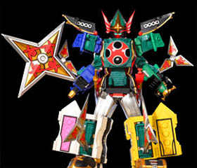 Hurricane GokaiOh When the Gokaigers use the Great Power of the Hurricanger Keys, they summon Fuuraimaru, which Gokaioh combines with in order to become Hurricane Gokaioh. In this state, Hurricane Gokaioh resembles Senpuujin. It is covered with shuriken and is armed with a weapon called the Shushutto Shuriken Chain. Its has an attack called the Gokai Infinite Shuriken during which Hurricane Gokaioh sends off a flurry of shuriken that strike the target. Its Gokai Fuurai Attack finishing attack has Fuuraimaru separate from Hurricane Gokaioh before performing the Secret Finisher Turbulence Cherry Blossoms, using a cloning ninpou on himself to attack the target with multiple shuriken. |