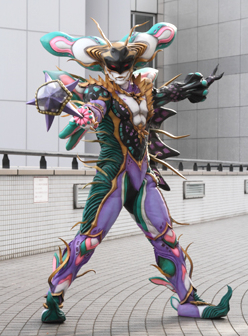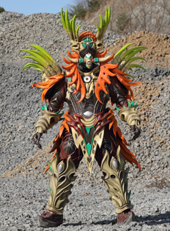 EPISODE FORTY-SIX Juju Height: 198 cm to 48.8m Weight: 142kg to 355 tons Known as the "Devilish Witch Doctor", Juju can use a special crystal to intensify the darkness in peoples' hearts. Among his victims were Doc and Gai, though Ahim manages to snap them out of the spell as the others confront him and attempted to destroy the crystal ball before he swallows it to keep his spell in check. However, with Ninjaman's help, the Gokaigers destroy Juju and restore everyone to normal. An enlarged Juju is then destroyed by Kanzen Gokaioh's Gokai Kanzen Burst with the aid of an enlarged Ninjaman. |