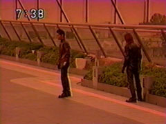 Sargain has a new Megakagame against Senpuujin... called Megakagame Mark II. Mugensai brings up the last one. The robot shoots energy at our heroes. They remember how their Gattling Attacker defeated him. Shurikenger arrives. | Isshu runs through a crowd of people running the opposite direction and spots the fight, which is making the ground shake. Isshu can't get contact with his brother, who is at a temple near a waterfall 'healed' by a man. |