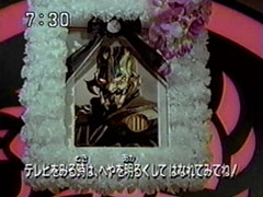 Isshu runs toward the monster and leaps in the air, avoiding Kabuto's protests, and strikes the monster. The lighting goes towards the other five. Satorakura comes out laughing and says the foe pretended to | be hurt. Isshu is shocked and drops the katana. The monster throughs food in the faces of the other four. They are made to swallow them and they bloat up and become baloons, soaring into the sky. |