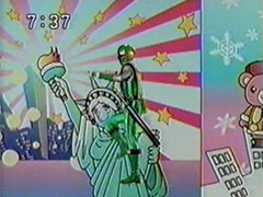 Imagines him tossing the trenchcoat aside to reveal abusiness suit and put on a pair of glasses. "Nice to meet you," he says. A globe-trotter, going all over the world, from New York, London, China, and Russia. "Hello! How are you doing?" | "It's a wonderful world, yeah!" He says in English. When this idea is bashed, Kouta shouts, "Why?" in English. The man moves on to a guitar store, making Nanami believes he is a rock star. She imagines him singing and then becoming Shurikenger. |