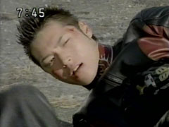 They jump into separate parts of the city. The trio are alone in a field. Yousuke yells. The three discuss and throw rocks off in the distance. They are joined by the brothers. They get a signal from Oboro. A hysterical newscaster reports the attack of the evil | clones upon the city but of course they think they are the real ones. Oboro growls in disappointment. The five race toward the city through the crowds of screaming people. Yousuke asks one injured woman who did this. She answers the Hurricanger. |