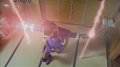 Jougami attacks Masumi with digital compact discs, dancing around him. This cuases an abnormaity in the automated system of the company. Red lights flash everywhere and a woman's voice announces traspassers. | The security camera tracks down Masumi as the threat. A laser machine appeared from an compartment from the wall and shot red lasers at him. Masumi docked for cover. Shizuka and Jougami then disappeared through another portal. |