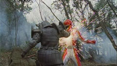 Masumi stands up and backs away as Mogari coninues asking for the Neck Preicous. The monster is then attacked. BoukenRed grabs Masumi and then land in the forest. BoukenBlue tends to Masumi. Mogari appears from the fog and is attacked by SurviBusters. | He reflects the hits and runs toward the Boukenger. They use their SurviBlades but he is too strong. Red is knocked down, Blue fights Mogari but is knocked down. Red tends to Blue but Mogari blasts them. He looks around, only for Bouken Red to dive his Bouken Javelin into his right shoulder. |