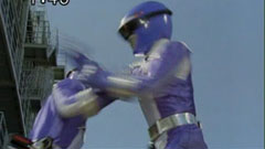 Shouta and Vril fight outside of a building. They leap in the air in streaks and fight up in the air. They both drop down. Shouta is hurt, down on the floor. Vril jumps up at him but Shouta manages to kick him away. Shouta recoups as Natsuki approaches. | She asks if he is the real one as the others arrives. Vril comes out from under a waste container, growling. Masumi says he will find the real one and transforms in BoukenBlack. He calls for his SurviBlaster. Akashi calls out for him. |