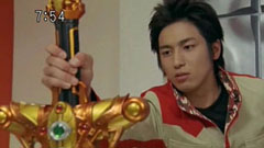 Red thinks this is a good thing and tries fighting off the monster but Zuban won't hit and it makes no effect. The monster then beats Red up. The sword flies out of his hands and into Gaja's. | The Boukenger re-coup. Gaja gloats in having all of Lemuria's powers together. He tries uses the sword and it declines. Pink teases him for not being able to control him either. |