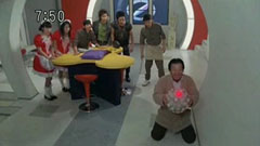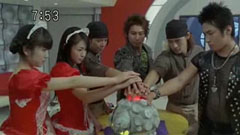 was training. All six figure out the clue: Morio's surname Makino has three characters. Mr. Voice appears and explains it was his idea to use a strange Precious to prepare for unusual situations. Morio | explains the Precious was stored in their Osaka branch for a long time. The gang start bashing and mistreating Prometheus Stone. They then throw all the costume and props on Voice and Morio. |