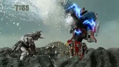 Through the fire, Ouga stands up and grows huge and shouts out 'Kei. ' Akashi transforms to save Eiji from the giant axe. Red pulls out his Gold Sword and makes Zuban, who grows huge and fights Ouga. Eiji says he will kill his soul with his family Takaoka | Way technique. Because he doesn't have his Khakkhara, it will take him a bit of time. Zuban bashes Ouga back. Ouga aims for Zuban but he avoids it and strikes the mountain. This creates rubble and giant boulder hurdling towards Red and Eiji. |