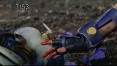 Shouta wonders why there is no road. They see something rumbling in a bush and Gekkou flies out. They don't even know who he is. Eiji ignores him but Natsuki picks him up. Gekkou recognizes her as | BoukenYellow. She is not for leaving an injured animal. Gekkou believes he can 'use' her. So he teleports them away. Eiji and Shouta are left wondering where they went in a midst of feathers. Meanwhile, the others |