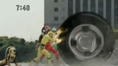 Go-Roader brings down a building. Yogo teases Gold. Roader goes towards Gold from an explosion and he is unable to detain it. He struggles to get up as Roader comes towards him again. Black, Red, Green, and Yellow stop the tire. | They say they must fight together and they are worried about Miu. Gold pushes it by its side and it returns to its small size and pops out the burnt Power Soul. They scold Hiroto. Yogo stops Hammer, but he tells him he doesn't need his help and grows big. |