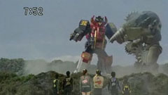 Speedor says they have been able to fight so far because of their partners. Red pulls the foot off him and slash at his nose with his sword until knocked down. The trio wake up and roar and leave the station. Red jumps up, is pushed down. | They arrive at the battle site and blow the foe down. They split up and T-Line and K-Line bite and flip the foe. Speedor arrives and tells Red to board them. He says they have never seen someone as pasisonate as him. He jumps in. |
