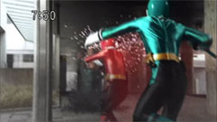 | He can't tell them but during lunch, he lets it sip about a 'lord' that is a creep that hits him on the head. So the monster attacks and instead of running like his friends, Chiaki shows off and transforms in front of them. He gets flipped back and the long | arm goes through the ground and punches Green. Again and again. Green leaps on the building and gets punched again, down to the floor. His friends come to him and get hurt. Red arrives and gets hit. The others arrive and check on the boys. |