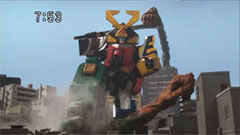 | Red catches up to the fist. Red gets punched back by the other fist. Green leaps above the monster and the foe gets hit by his own arm. The rest of his arm gets tied up by all the running Green did. Green finishes him off. | The others arrive. The monster grows and Green thinks he can do it on his own and makes his Origami big. Bear tackles the monster but is pushed back. ShinkenOh is formed even though Chiaki doesn't want to. The foe does his attack again. |