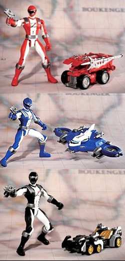 Gougou Formula and Boukenger Set - Each sold seperately, Bouken Black, Bouken Red, and Bouken Blue with their GouGou Vehicles. Vehicles can make armor for the figures. |