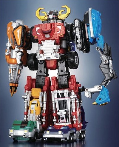 DaiBouken - Dump, Formula, Gyro, Diver and Dozer become one robo with two weapons that combine into one. |