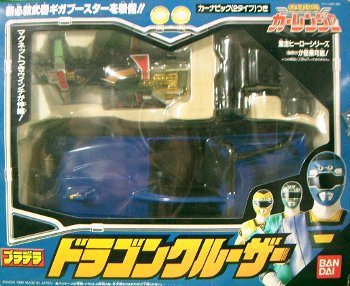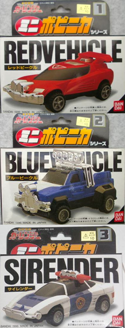 Carranger figures - Each (Blue Racer, Green Racer, Red Racer, Pink Racer and Yellow Racer) came with their personal weapon (Fender Sword, Muffler Guns, Engine Cannon, Side Knuckles and Bumper Bow), Viblade and Auto Blaster sidearms, and badge sheild. Red Racer came with stand for the Giga Formula, the personal weapons formed to make a Giga Formula. |