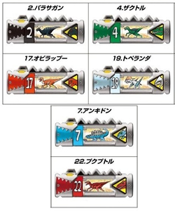Zyudenchi Gashapon Set 5 - #1 Gabutyra, #6 Pteragordon, #6 Pteragordon (Deboss version), #8 Bunpachy, #18 Igeranodon, #22 Pukuptor, and #23 Futabain. |