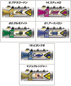 Zyudenchi Gashapon Set 4 - You can find #2 Parasagun, #4 Zakutor, #6 Pteragordon, #11 Deinochaser, #21 Archenolon, #23 Futubain, and Magiranger. |