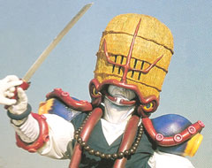 EPISODE 22-23 Dotoumusha The most powerful of Budoh's Majin, Dotoumusha is a red lobster-themed samurai warrior. He is sent in Budoh's final attempt to draw the Galaxy Lights from the Earth. Dotoumusha creates a force field to prevent interference from the Gingaman and uses his staff to draw out the Lights. Although the rangers destroy the force field, they are unable to prevent the Lights from being released. In a desperate chase, Dotoumusha captures the Lights in a magical urn. He is then tricked into using the Lights for himself in Iliess' scheme to mark Budoh as a traitor. In an attack by BullBlack, though, Dotoumusha loses the Lights to the Gingaman, who use their newfound powers to kill him before he could use the Baruba-X. |