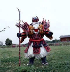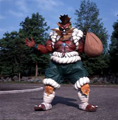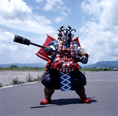 EPISODE 18 Kairikibou He wields a large red sledgehammer. For thousands of years, nothing could withstand the crash of his hammer. Finding the "Oni Stone" an unbreakable stone that supposedly contains the Galaxy Lights, Karikibou prepares to smash the stone open with his sledgehammer. He hit the stone three times, which broke the hammer's handle apart. When the Gingaman fire their Juugekibou at Kariikibou, he held the stone in front of him to take the blast. The stone was undamaged, but BullBlack succeeded in slicing the stone in half, while killing the Majin in the process. The stone was revealed to be free of the Galaxy Lights. Killed again by the Megarangers in 'Gingaman vs. Megaranger'. |