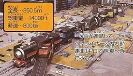 GoLiners The GoLiners are five super powered train cars which combine into the Grand Liner. The GoLiners are deployed from the Bay Area 55. The Grand Liner can also be launched from the track into the sky, where it transforms into the Grand Liner, and descends back to the ground. The Grand Liner can fire turbine blasts from its left shoulder, and missiles (explosive or freeze) from its right shoulder. The shoulder attachments can be moved to the hands as well. The Grand Liner was destroyed in battle against Salamandes Dragon and Zylpheeza II. GoLiner 1 Length: 49.3m Weight: 2700 t GoLiner 2 Length: 50.7m Weight: 3600 t GoLiner 3 Length: 48.2 Weight: 3400 t GoLiner 4 Length: 51.8m Weight: 2650 t GoLiner 5 Length: 50.5m Wieght: 2650 t |
