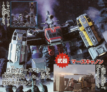 The Mars Machines are five spacecrafts which can combine to became the Victory Mars. It can also combine into a four legged creature. The Mars Machines are deployed in the Goliners, which is pulled into space by the Max Shuttle. Victory Mars uses a staff known as the JetLance for combat, which it powers up for a finishing move, in which it launches the MarsFlare. It can also become a laser gun known as the MarsRapid. It can also wield and charge the Bravor Sword. When the Gingaman came to fight an evil, the Lights of Ginga powered up the Victory Mars with Super Armor Shine for a final battle against King Gil.