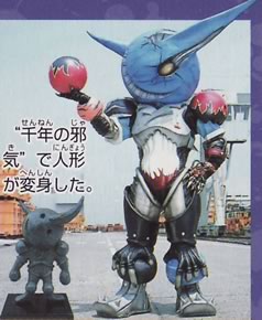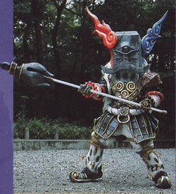 EPISODE 36, 42-43 Mateki Org Some sources says it translates to: Demon Whistle, Magic Flute He interupts Shirogane and Tetomu's daily serenade to Gao Deer with his own music by channeling his music into Shirogane's flute. He is not that sure about himself, he was charged by power from Tsuetsue and Yabaiba by Rasetsu. Once upgraded, his sweet music is less sweet and he forces people to dance under his command. Tetomu's voice weakens him. When the Gaoranger call their Power Animals, the Org blocks the sound from their swords. GaoGod comes down and destroys his flute. GaoIcarus is then able to destroy it. The Rangers faced it in Duke Org Dorodoro's dimension. He was brought back as a spirit by Duke Org Dorodoro. |