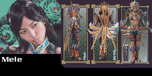Mele is a Rinrinshi who was previously a Confrontation Beast Chameleon-Fist user. She was brought back from the dead by Rio and has pledged her heart to him. Through Ron's ritual Gengi 'Turned Phatom-Storage,' Mele is infused with Genki and reborn as a Phantom General in Episode 37, mastering the GenJyu Phoenix-Fist style. She shows off her new powers to the Gekiranger in Episode 38. Mele's Gengi "Flame-General Fearful-Desire" projects her Genki as a phoenix to consume her opponents in flames. In Episode 45, when GekiRed defeated Rio in his GenJyuOu form, he grew giant and was unable to control the form. Mele screamed out to her love and only her voice was able to stop his rampage. He returned to normal size and Mele grabbed him to retreat, before he could question Ron. She was angry at Ron and knocked him out of the way twice. In Episode 46, Rio took a killing blow that was meant for Mele from Ron. Ron then punched Mele in the gut and took her hostage in order for Rio to continue with his plan. Ran, Retsu, Gou, Bae, and Ken head to the Confrontation Beast Hall dojo to save Mele and take on Ron. After much convincing by Jan, Rio came to save Mele. Along with Rio, she shed away her GenJyuKen form. She joined Rio and the Gekiranger to defeat Ron. Her motifs are the Vermilion Bird and the Rooster (Chinese Zodiac) of the Earthly Branches. |