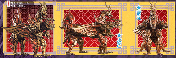EPISODE FORTY-ONE to FORTY-TWO Sojo Height: 203 centimeters to 54.8 meters Weight: 87 kilograms to 23.5 tons He is one of Ron's Twin Phantoms. A master of the GenJyu Addanc-Fist. An Addanc is a Welsh mythology lake monster that its appearance changes depending who is telling it. It varies from resembling a crocodile or beaver. Addanc has also been spelled avanc, afanc and addane. Sojo is the hyperactive aid of Dorou, purposely allowed himself to be attacked by the Gekirangers with his teeth sucking up the Geki and Shigeki for Dorou's experiment. He then threw Dorou Grain on humans to make them disappear. He porformed Strikeless Descend Illusion, which was an illusion to make him and Dorou switch places. His attacks include the spinning Impliment Style Risk Halt and the lighting attack called Ready Separate Beauty Advantage. He can also combine these and porform a combo with Dorou. He survived the GekiBeasts attack but was destroyed by SaiDaiGekiTohja. His name is based on Ju Ru of the Shan Hai Jing. His motif is the Rat of the Chinese Zodiac. |